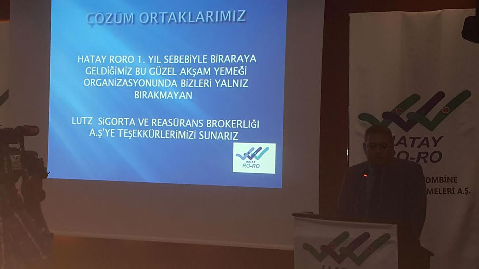 21 Ekim Çarşamba akşamı Büyük Antakya Oteli'nde Lutz Sigorta ve Reasürans Brokerliği'nin sponsorluğunda gerçekleşen özel geceye ilgi ve katılım yüksekti. Hatay Ro-Ro ortakları, kamu ve özel sektör temsilcilerinin yanı sıra UND Başkan Yardımcısı Sn. Kamil Sağ ile yönetim kurulu üyeleri Sn. Kemal Gül ve Sn. Ali Kuş'un da hazır bulunduğu özel gecede Hatay Ro-Ro Yönetim Kurulu Başkanı Sn. İbrahim Güler bir açılış konuşması ve sunum yaptı. Konuşmasında ortadoğu coğrafyasındaki karışıklıklar nedeni ile 1 yıl önce uluslararası taşıma yapan firmaların karşılaştığı zorluklar ile o günden bugünlere nasıl gelindiğini ve ikinci geminin de eklenmesi ile yakaladıkları başarıyı net bir şekilde ortaya koyan Hatay Ro-Ro Yönetim Kurulu Başkanı Sn. İbrahim Güler konuşmasının sonunda bu özel akşam yemeği organizasyonunda kendilerini yalnız bırakmayan Lutz Sigorta ve Reasürans Brokerliği'ne teşekkürlerini de sundu.